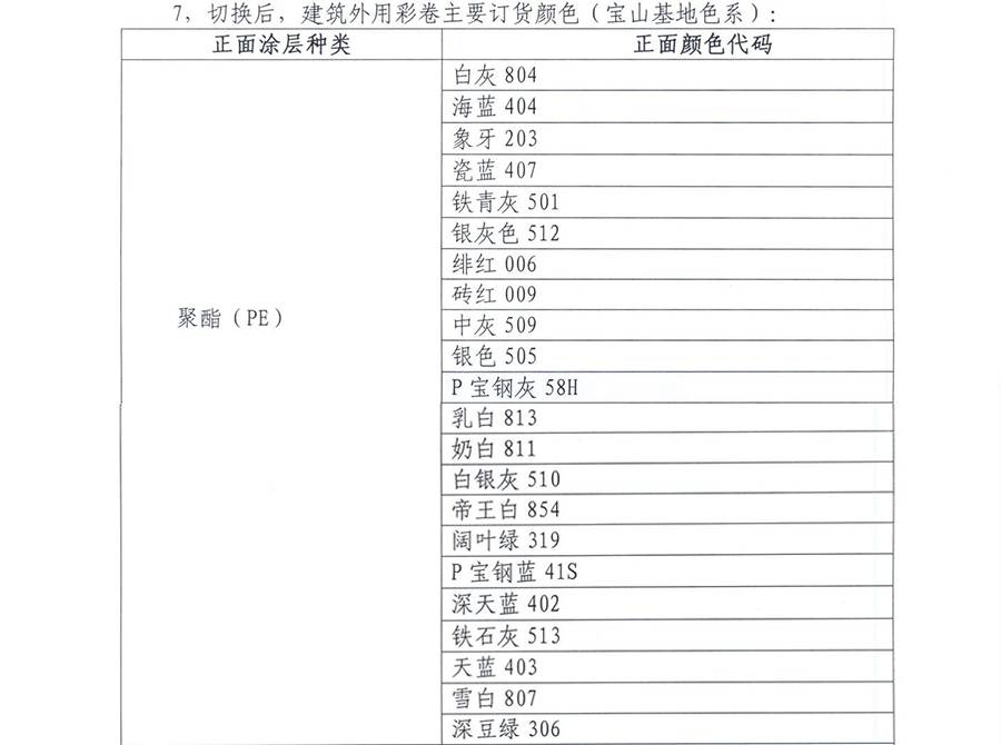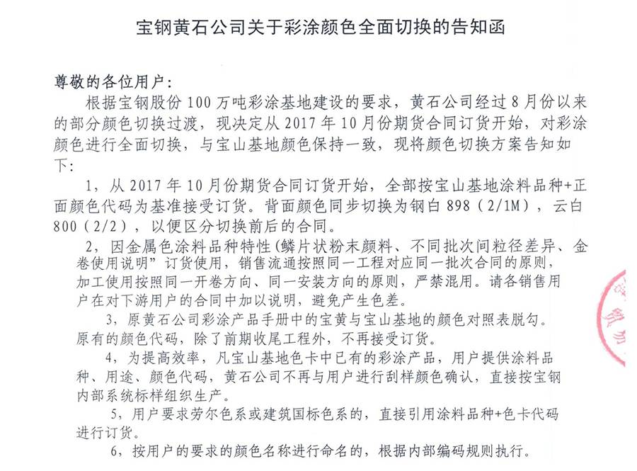 9月5日,寶鋼黃石發(fā)布了《寶鋼黃石公司關注彩涂顏色全面切換的告知函》,其告知函全文如下: