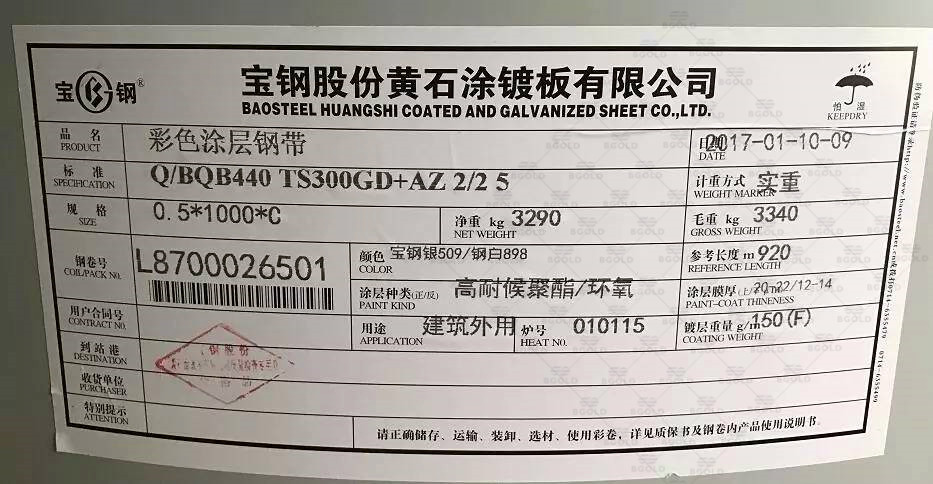 寶鋼黃石彩涂卷噴碼為:BAOSTEELHUANGSHI+Z/AZ