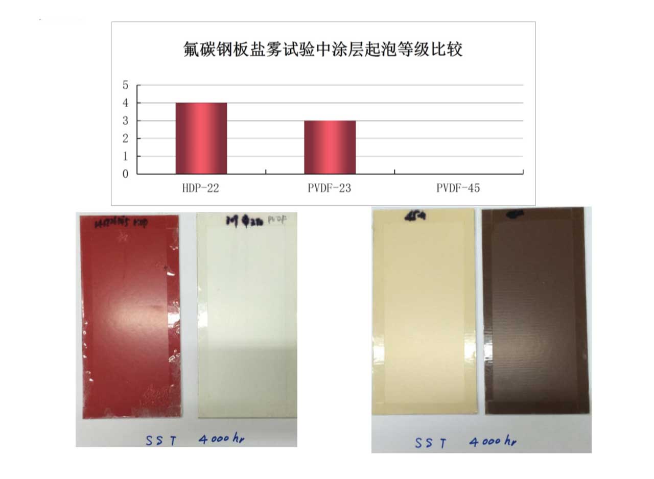 經(jīng)過4000小時鹽霧試驗后,45微米氟碳產(chǎn)品涂層仍保持0級。