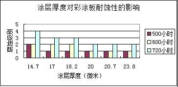 從微觀上講、涂層是多空的組織。空氣中的水、腐蝕介質(zhì)(氯離子等)就會通過涂層的薄弱部分侵入,造成膜下腐蝕,進而涂層起泡并剝落。另外,即使同樣涂層厚度,二次涂層要比一次涂層致密。根據(jù)國外報道和相關(guān)腐蝕試驗結(jié)果,正面涂層20μm以上才能有效的防止腐蝕介質(zhì)的侵入,由于底漆和面漆的防腐蝕機理不同,不僅要規(guī)定總膜厚,還有分別要求底漆(》5μm)和面漆(》15μm)的厚度,只有這樣,才能保證彩涂鋼板不同部位的耐蝕性是均衡的。