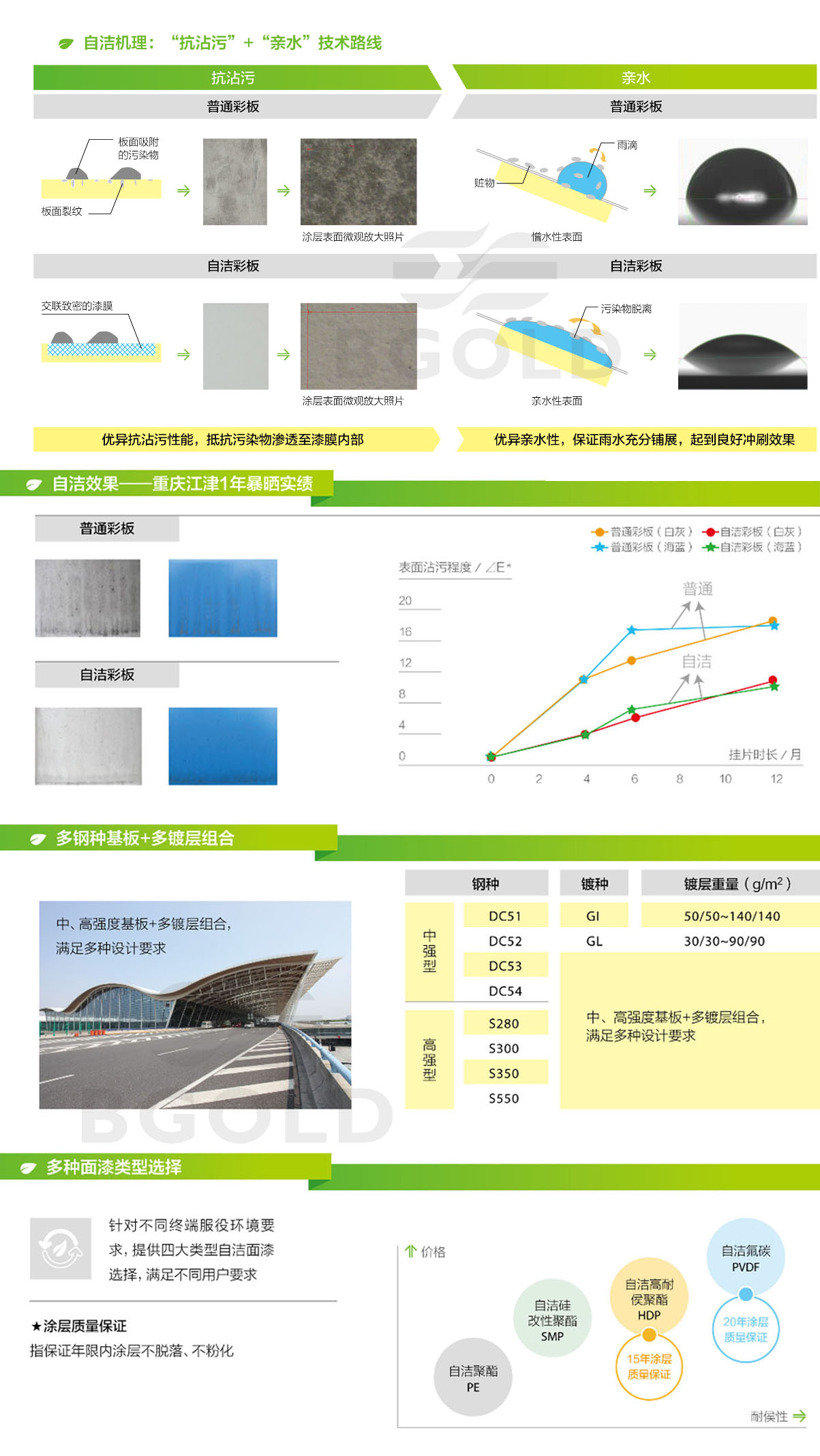鋼專(zhuān)門(mén)針對(duì)污染地區(qū)建筑用材開(kāi)發(fā)的一系列具有自我清潔功能的彩涂鋼